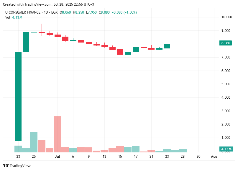 The period marked the trading debut of U for Consumer Finance, otherwise well known for its brand name Valu (VALU), one of EFG Holding’s (HRHO) subsidiaries. The stock started its trading with a strong euphoria, having jumped to its maximum allowed levels on two consecutive days. Later on, investors traded the stock lower as they took some of their gains off the table.